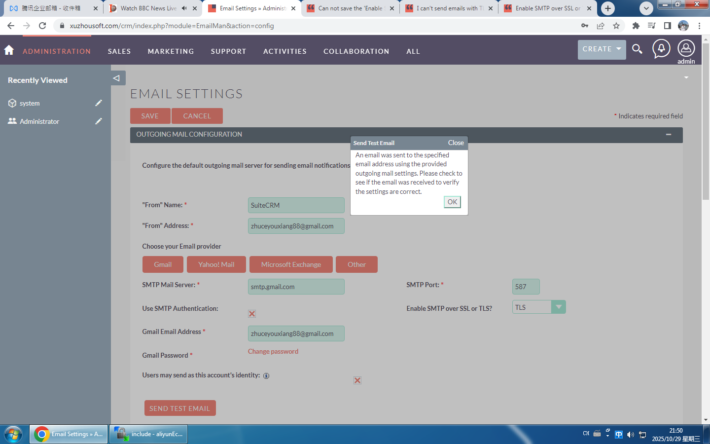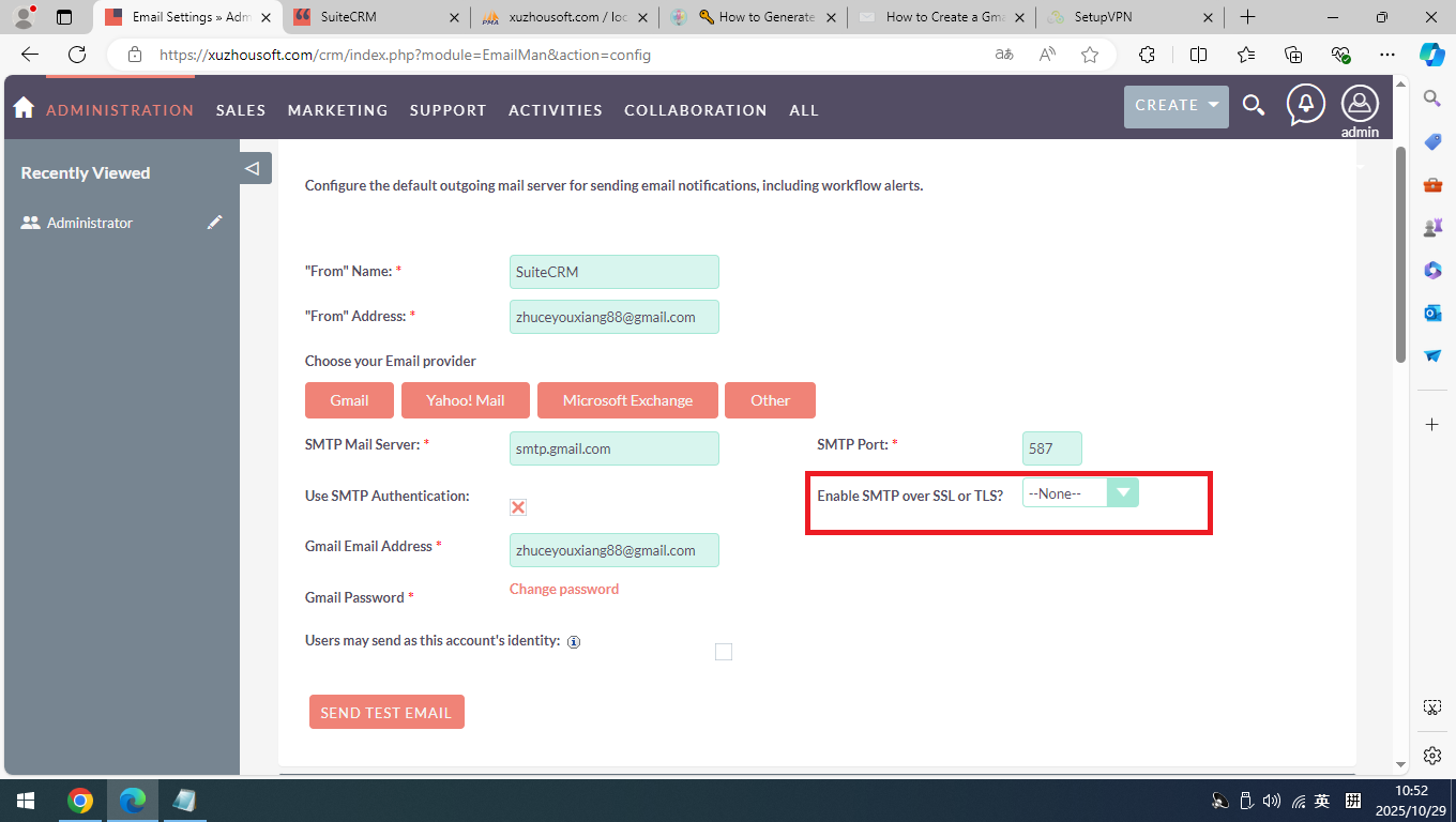 But each time when I chose the “TLS” and clicked the “save” button in the email setting interface the “Enable SMTP over SSL or TLS” drop down list became “none”.