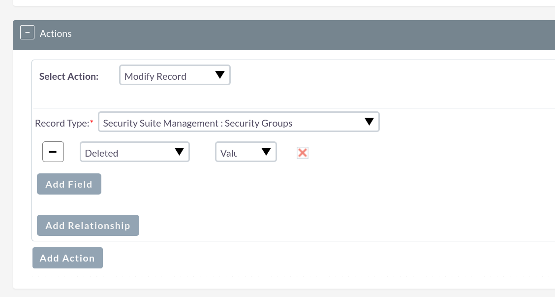 How to implement the deletion of security groups within workflow actions