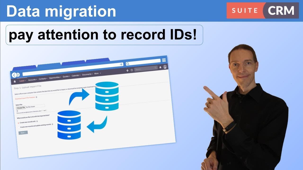 import it into the SuiteCRM server, but donât edit config.php to make it become the SuiteCRM database. Just leave it there, side-by-side with the SuiteCRM database, to facilitate moving data