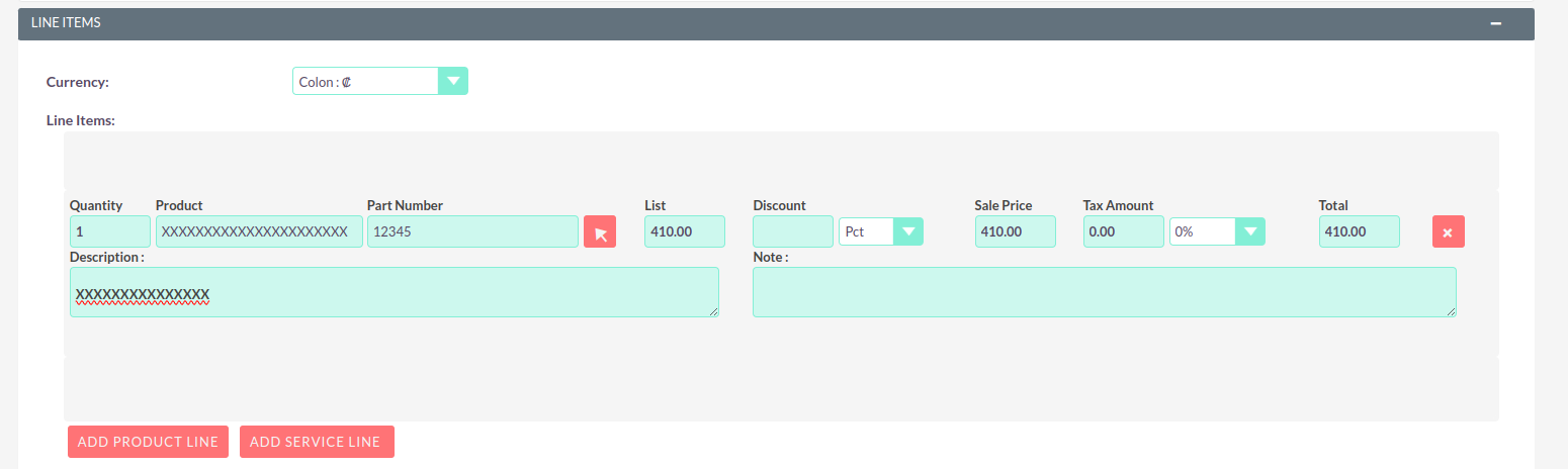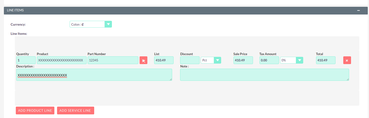 When the currency in the quote or invoice is set to COLON by default, it loads correctly.