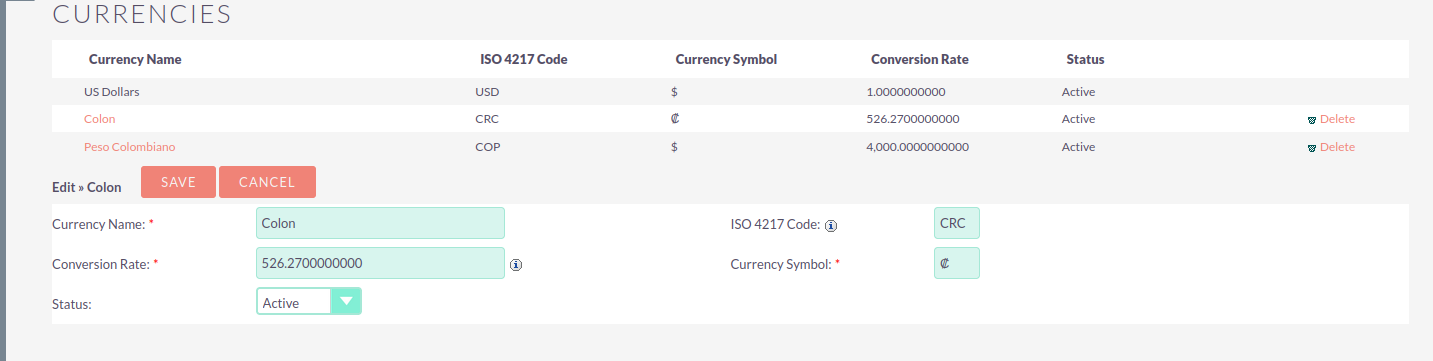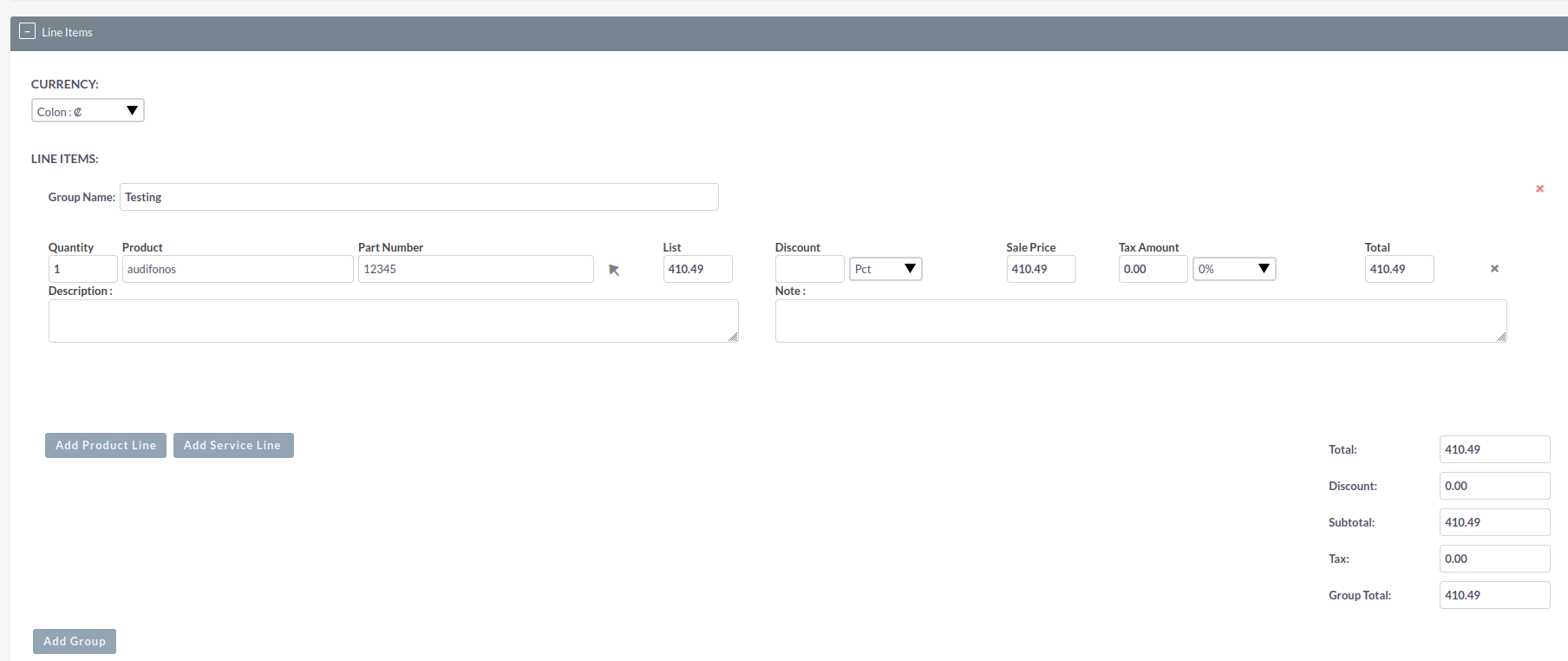 When I go to the Quotes module (this also happens in the Invoice module), I load the product, and with the currency dropdown set to COLON, it shows the correct value of 410.00. However, if I change the currency dropdown to another currency and then switch back to COLON, it calculates the price as 410.49.