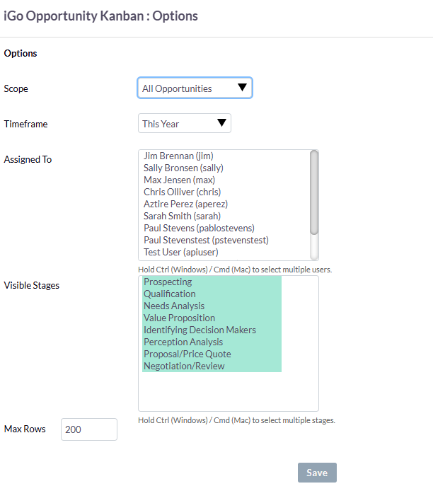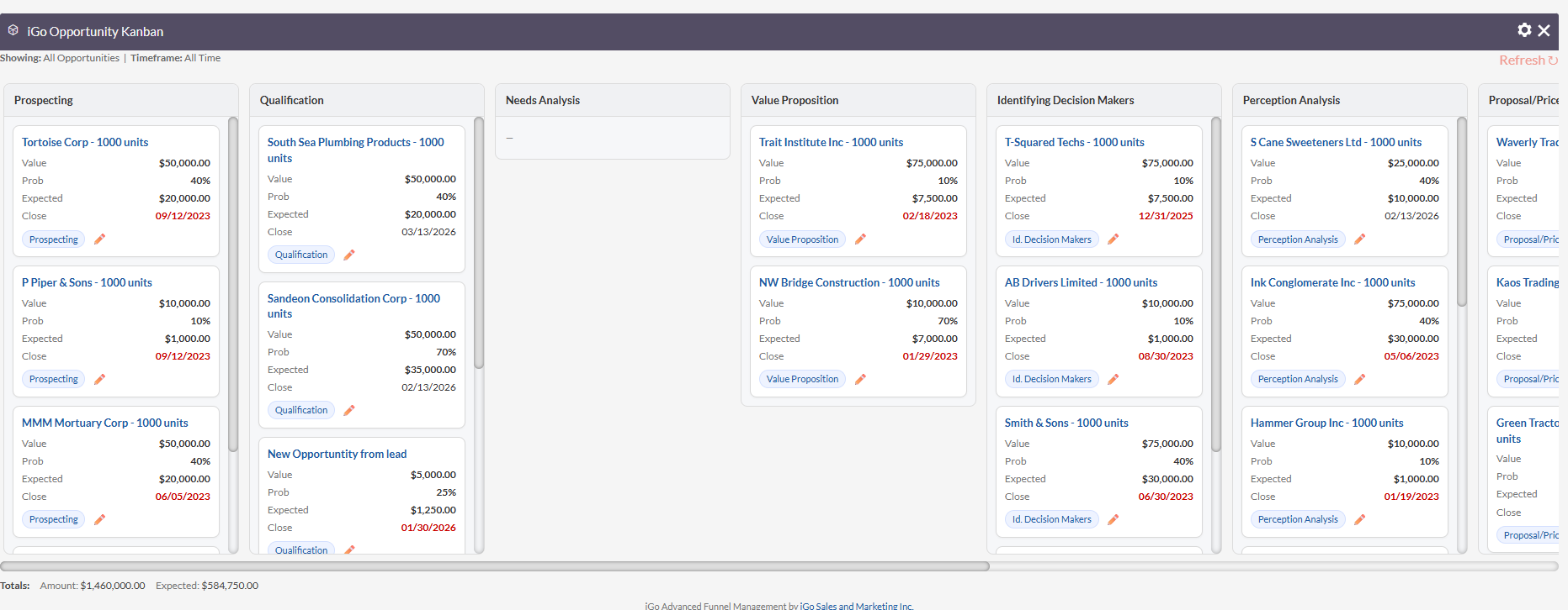 A true front-end Kanban by sales stage (open pipeline only), not a static report