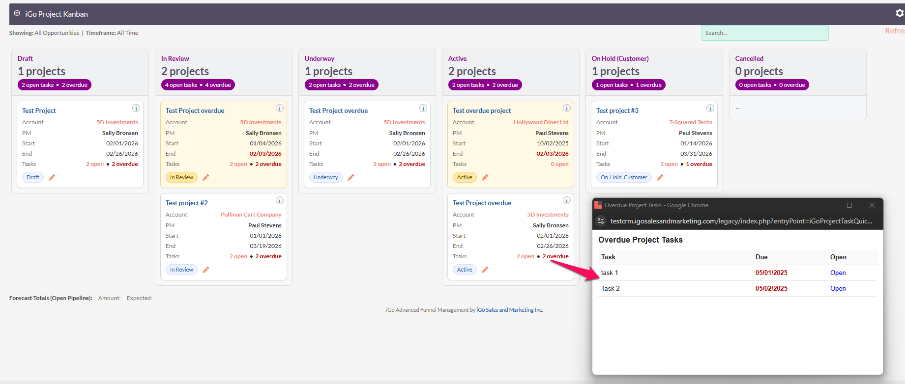 Today’s progress, finished up the project stats, and added a drill down popup for open tasks and overdue tasks for the project card.
