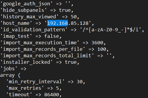 Hi IĀ“m having troubles with the conection some times when my users try to access certain information on the CRM, it uses the IP 192.168.85.128 I donāt remember if this is from the test eviroment but i found out in the config file this information, should I change the IP to the actual cloud IP?