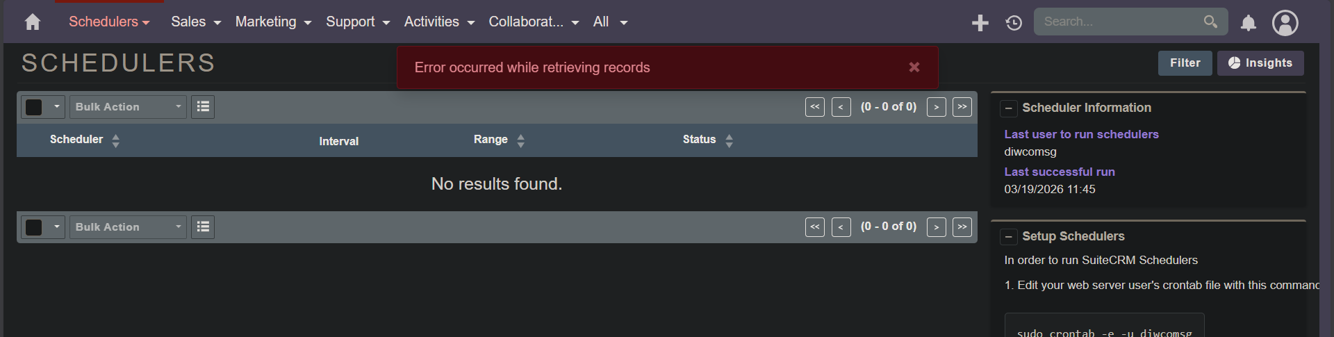 We encounter this issue which we have not encountered before. When accessing the Schedulers page, no scheduler is listed. An error message is shown “Error occurred while retrieving records“.