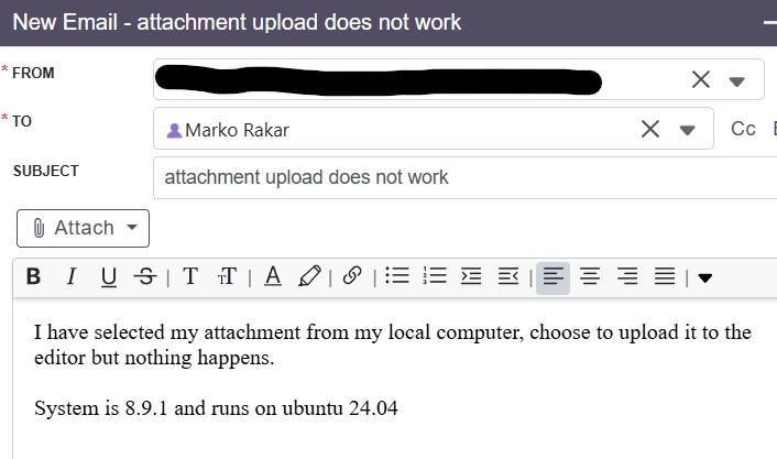 Simply, when I slect file to upload as attachment - nothing happens.