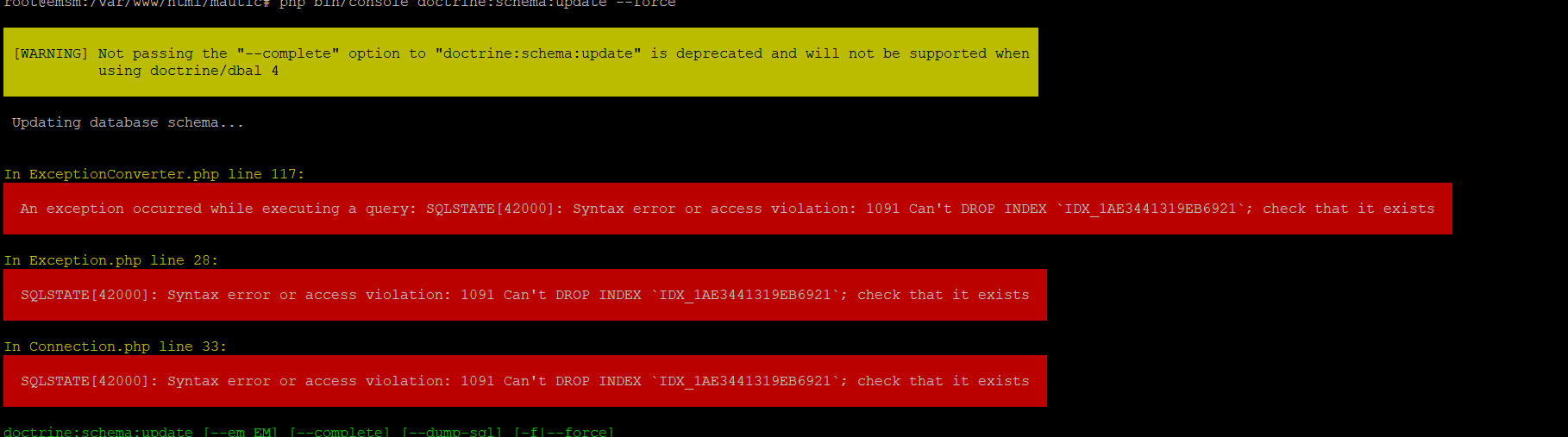 If I recall on the forum it suggests editing the doctrine update file and removing the directive to remove the index, which isnāt necessary, since you donāt have it anyway.